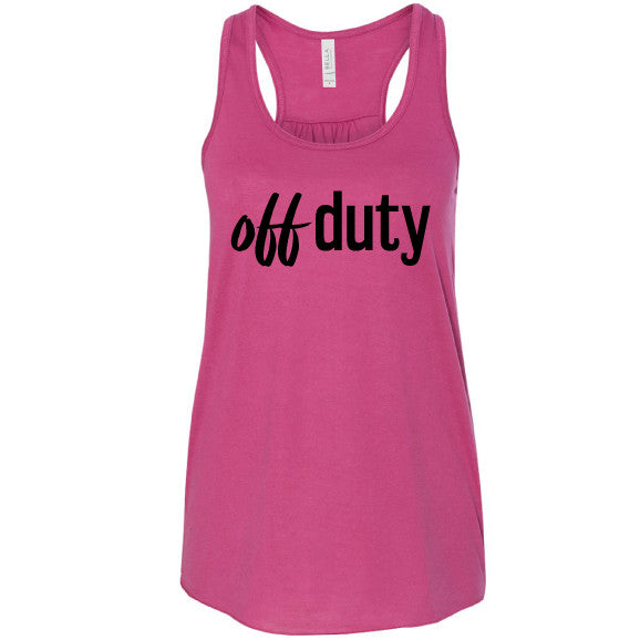 OFF DUTY. That's right Mama needs a break. #momlife -- This exclusive NBT Threads design is a limited edition run and printed on a SUPER COMFY PINK Women's fit flowy racerback tank with BLACK Print -- perfect for your vacations and mommy breaks!
